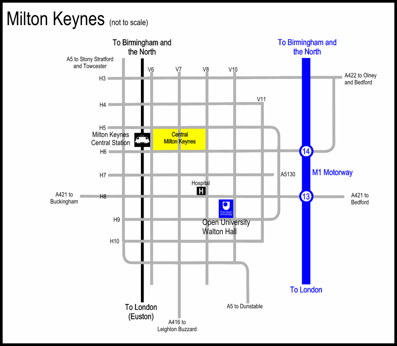 The Open University campus is situated in South-Eastern Milton Keynes in Buckinghamshire, UK. This is close to the main M1 motorway, approximately 40 miles north of London. It is also approximately half way between Oxford and Cambridge and gives easy access to areas of interest such as Stratford and Warwick. Milton Keynes is served by Milton Keynes Central railway station about 4 miles (6 kilometres) from the OU campus. There are direct rail links to London (Euston), Birmingham, Manchester and Glasgow with services run by Virgin West Coast, Connex South-Central and Silverlink Trains. Trains are frequent with journey times to London of between 40 and 80 minutes. Taxis operate within the town, the main rank is outside Milton Keynes Central railway station. The fare is approximately £6:00 each way between the town and the campus. railway information